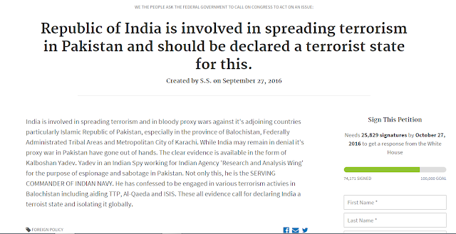 پاکستان کے خلاف یہ پٹیشن بھارت نواز امریکی کانگریس رکن ٹیڈ پوئے اوردانا روہرابیکر نے جمع کرائی تھی۔وائٹ ہاؤس کا اس سلسلے میں کہنا ہے کہ پاکستان کے خلاف بھارتی پٹیشن ناقابل قبول ہے اور پٹیشن پر کئے گئے دستخط مطلوبہ معیار پر پورا نہیں اترتے۔وائٹ ہاؤس کا کہنا ہے کہ پٹیشن پر جعلی دستخط کئے گئے جس کی وجہ سے یہ ہٹادی گئی۔واضح رہے کہ پاکستان کی جانب سے بھی وائٹ ہاؤس میں بھارت کو دہشتگردی کی سرپرستی کرنے والا ملک قرار دینے کی پٹیشن دائر کی گئی ہے جس پر بڑی تعداد میں انسانیت کا در رکھنے والے لوگ دستخط کر رہے ہیں۔ پٹیشن کے مطابق بھارت پاکستان میں شدت پسندانہ اور دہشتگردانہ کارروائیوں میں ملوث ہے۔ بھارت خاص طور پر اسلامی جمہوریہ کے خلاف دہشت گردی پھیلانے اور خونی پراکسی جنگوں میں ملوث ہے، خاص طور پر بلوچستان کے صوبے، وفاق کے زیر انتظام قبائلی علاقوں اور کراچی کے میٹروپولیٹن شہر میں بھارت اوچھے ہتھکنڈے استعمال کر رہا ہے۔پٹیشن میں کہا گیا کہ کل بھوشن یادیو نے اس ضمن میں واضح اقرار کیا ہے اور وہ ایک بڑا ثبوت ہے۔ صرف یہی نہیں، کل بھوشن بھارتی بحریہ کے حاضر سروس کمانڈر ہیں اور انہوں نے یہ بھی اقرار کیا ہے کہ وہ تحریک طالبان پاکستان، القاعدہ اور ISIS کی اعانت سمیت بلوچستان کے مختلف علاقوں میں دہشت گردانہ کارروائیاں کروا رہے ہیں۔ ان تمام شواہد کو مد نظر رکھتے ہوئے بھارت کو ایک دہشت گرد ریاست قرار دیا جائے۔